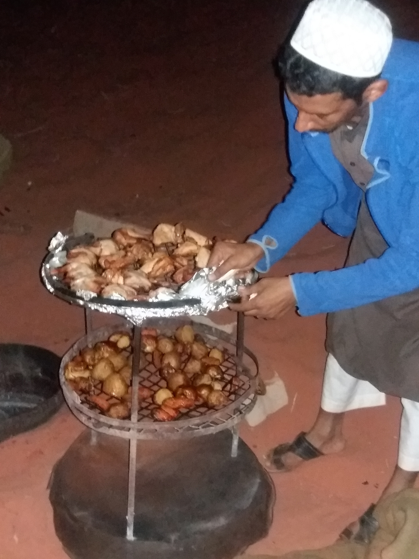 Το γεύμα μας λιτό και όχι όπως θα το περίμενε κανείς όμως καθίσαμε σε μαξιλάρες κατάχαμα όλοι μαζί παρέα με τον Αλί να μας διηγείται ιστορίες από τον προπάππου του που είχε γίνει ιδιαίτερα γνωστός στη χώρα γιατί σκότωσε ένα τίγρη με μια έξυπνη παγίδα που έστεισε και έστειλε ως δώρο στο βασιλιά το δέρμα του το οποίο στόλισε στο γραφείο του. Το γεύμα ολοκληρώθηκε με το τσάι μας ασφαλώς που οι Βεδουίνοι πίνουν ασταμάτητα όλη μέρα.