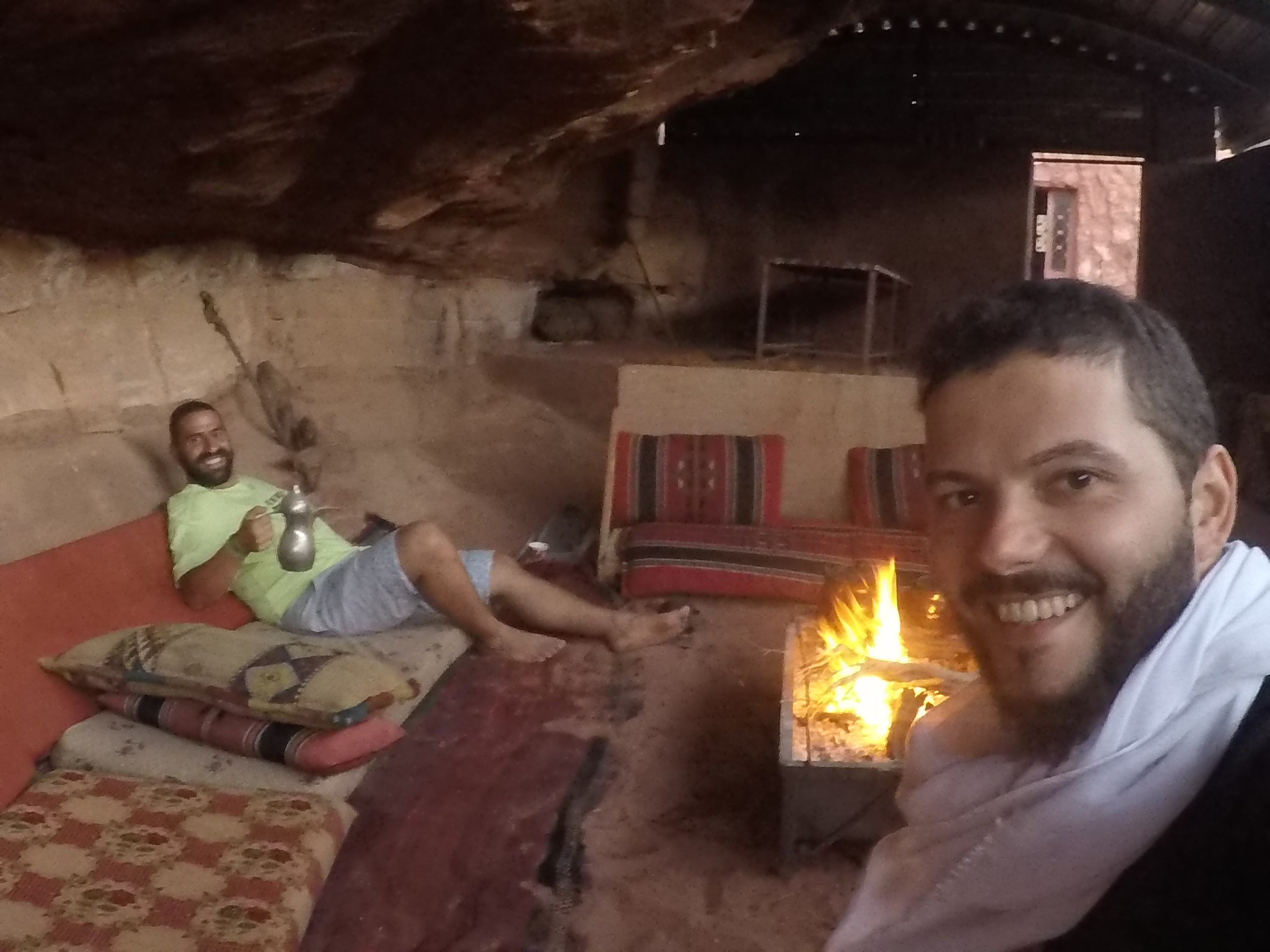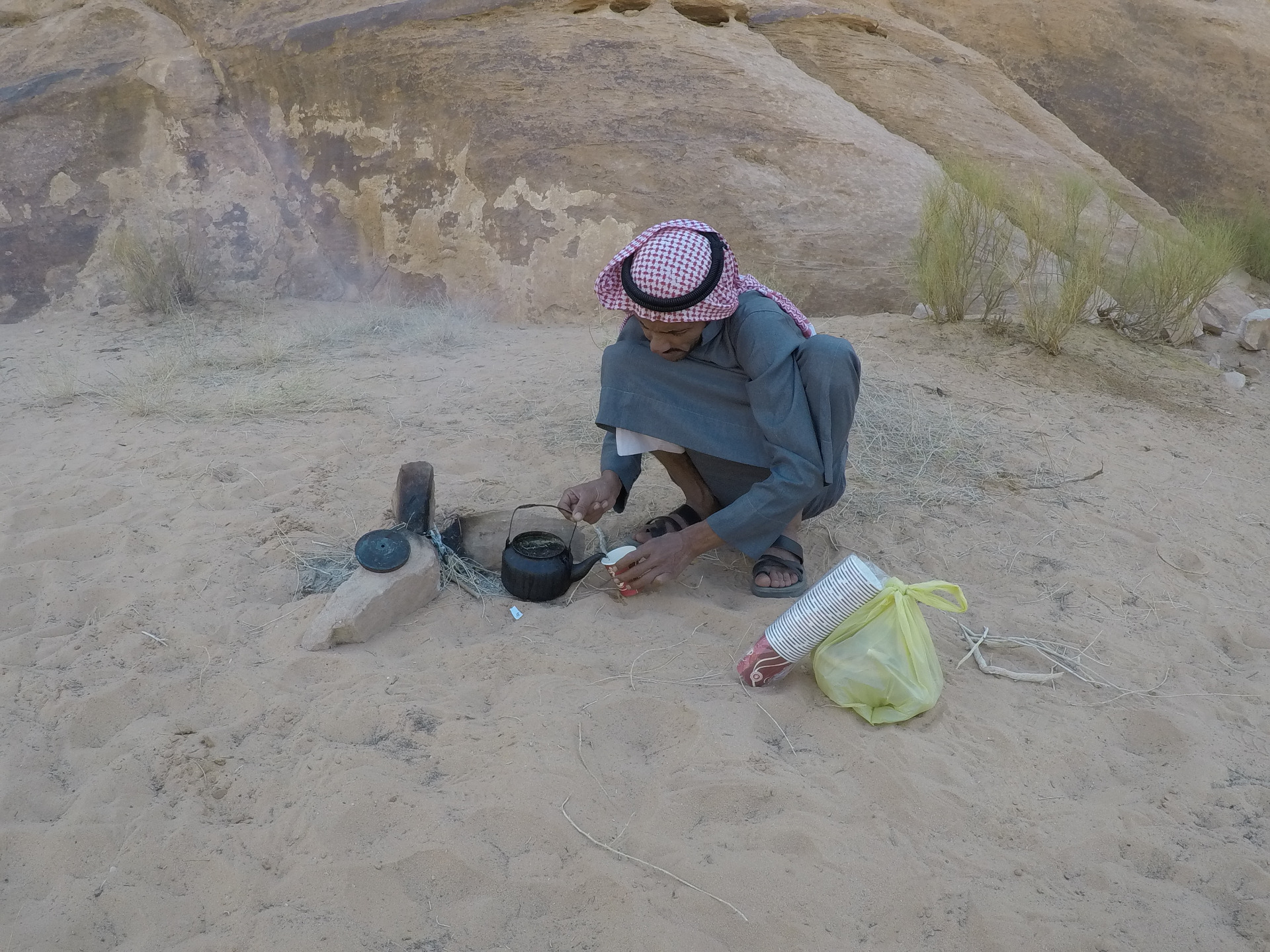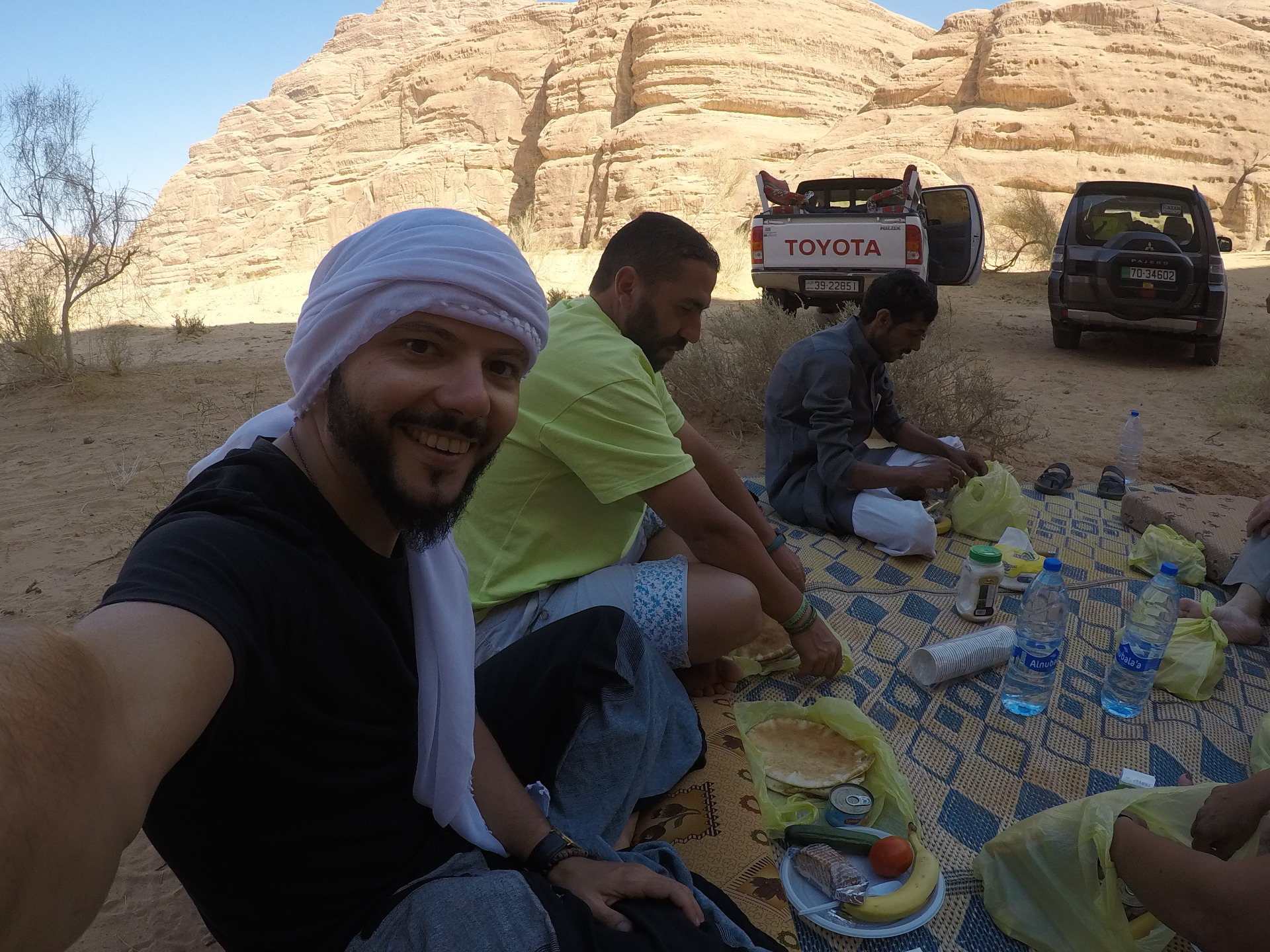 Το γεύμα μας λιτό και όχι όπως θα το περίμενε κανείς όμως καθίσαμε σε μαξιλάρες κατάχαμα όλοι μαζί παρέα με τον Αλί να μας διηγείται ιστορίες από τον προπάππου του που είχε γίνει ιδιαίτερα γνωστός στη χώρα γιατί σκότωσε ένα τίγρη με μια έξυπνη παγίδα που έστεισε και έστειλε ως δώρο στο βασιλιά το δέρμα του το οποίο στόλισε στο γραφείο του. Το γεύμα ολοκληρώθηκε με το τσάι μας ασφαλώς που οι Βεδουίνοι πίνουν ασταμάτητα όλη μέρα.