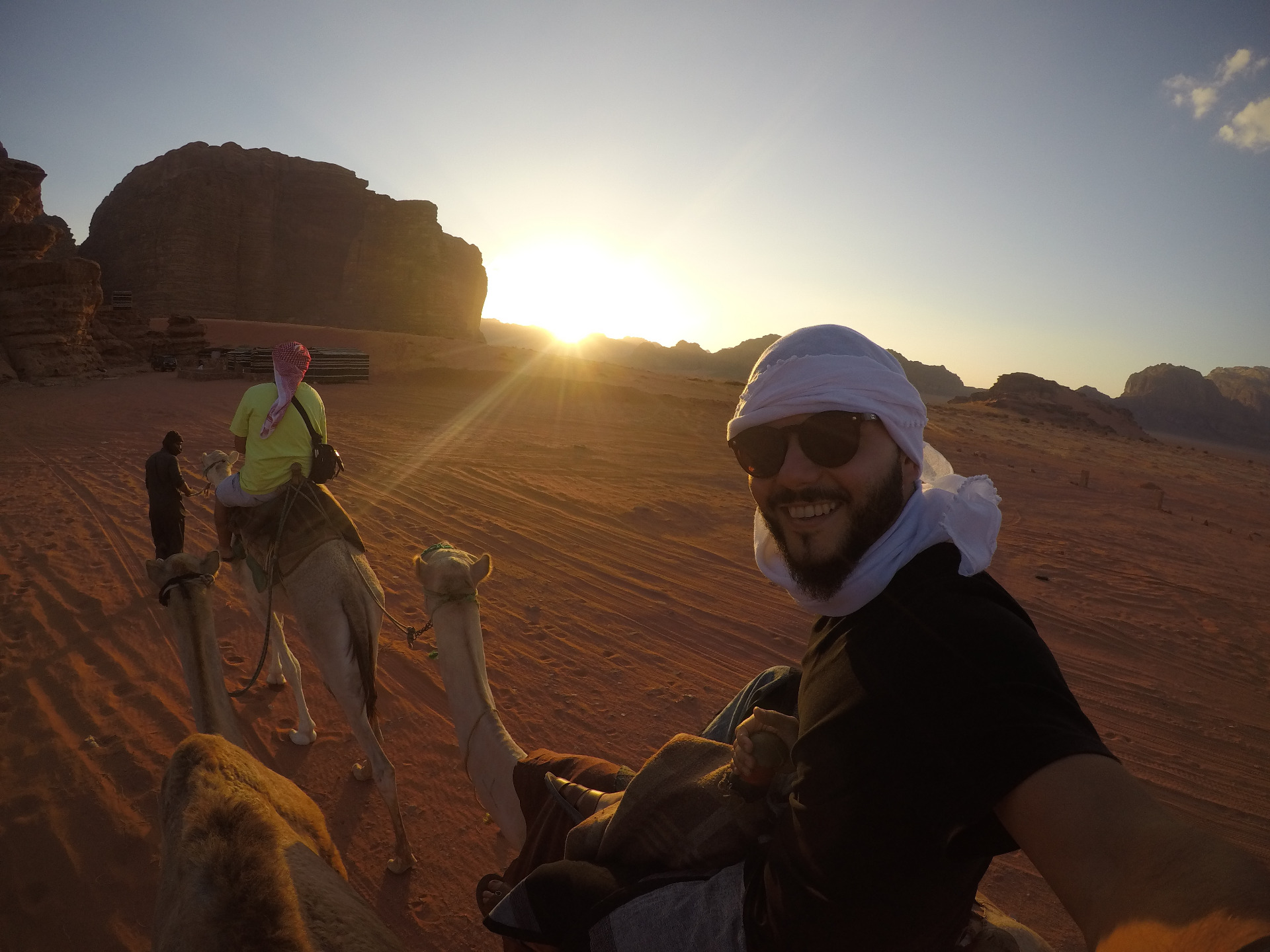Κατά την επιστροφή μας στο κάμπινγκ θα συναντούσαμε τις καμήλες που είχαμε κανονίσει με τον Αλί για να κάνουμε την βόλτα μας στο ηλιοβασίλεμα και πράγματι τα χρώματα ήταν υπέροχα. Για να είστε άνετα πάνω στην καμήλα βάλτε το ένα πόδι σας μπροστά από την χειρολαβή της σέλας, πραγματικά βολεύει πολύ!